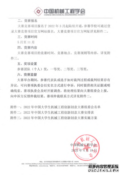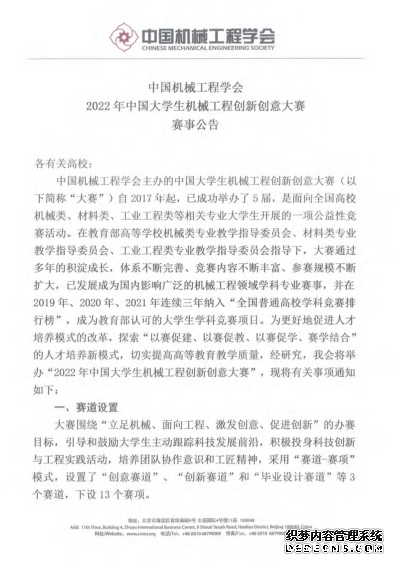 目前,2022年大赛已开始报名参赛。欢迎各高校踊跃报名参加大赛竞赛项目,获奖证书将由中国机械工程学会颁发。大赛赛事信息详见大赛公告(附件)。